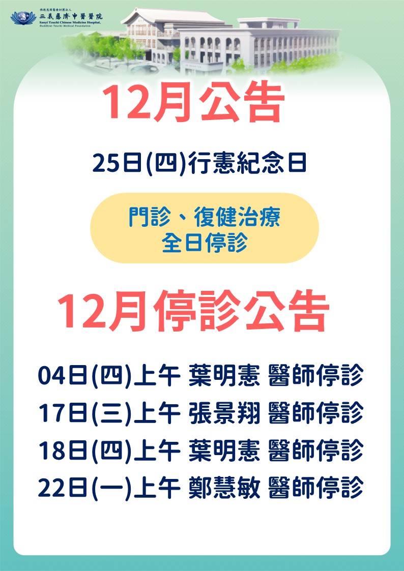 上一篇文章: 行憲紀念日&元旦門診資訊公告